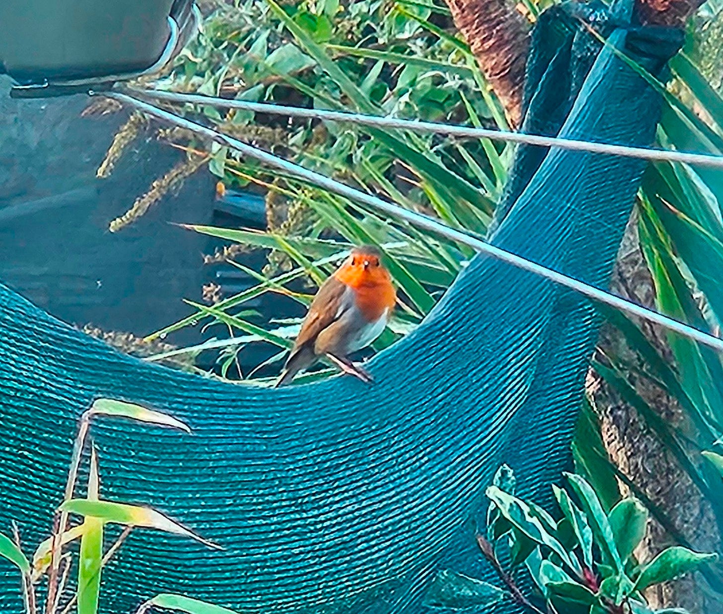 On a chilly morning, a robin lands on the fence and looks straight at me.